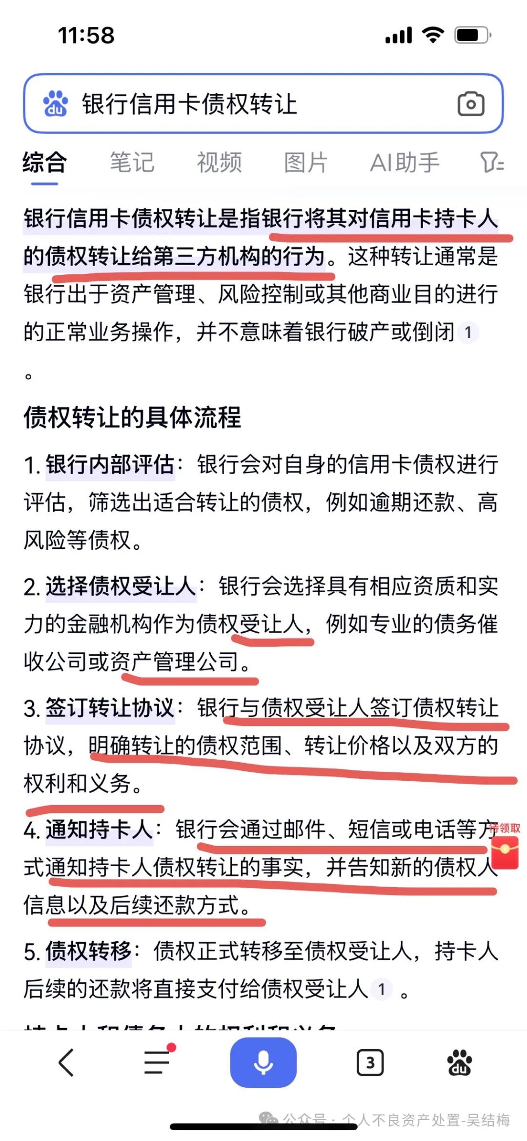 第三种:债权转让:总欠款40%结清(交付率高) 10万欠款,4万➕500公证费!通过债权转让AMC把你的债权从银行买回来,处理时间:6到18个月!