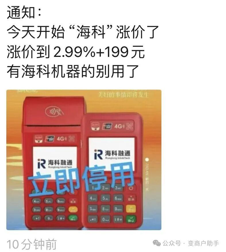 嘿,各位!海科这波操作真是太突然了,啥预警都没有,直接涨价,而且所有用户都得跟着遭殃,官方还说这涨价的决定不会改了。咱不管是新用户还是老用户,以后每笔交易的费用都得大幅增加了。这新的费率结构是万299+99+3,对于那些经常用的人来说,这费用增加得可太厉害了,就跟那“割韭菜”似的,让人心疼啊。