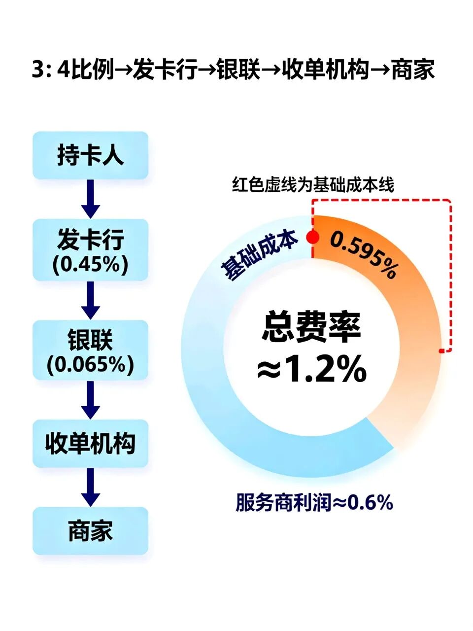 - 收单机构服务费:POS机服务商(比如拉卡拉、随行付)的运营成本,包括机具维护、客服、合规备案等(约0.085%)。