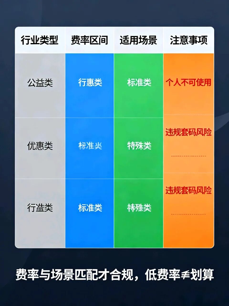 注意:优惠类和公益类费率有严格的商户资质要求,个人或普通商家用这类费率的POS机交易,就是“套码”,属于违规行为。那些声称“所有场景0.38%”的机具,百分百是跳码机。
