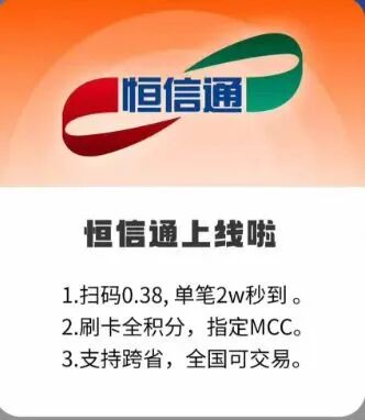 恒信通,北京恒信通公司的产品。属于小众产品,所以上市以来一直稳定,四年来没有涨过价,很牛的产品。主要亮点就是全积分、自定义商户,可以注册7011住宿、5812餐饮之类的商,也是为数不多可以注册7011商户的产品,比如星驿付也可以注册7011。