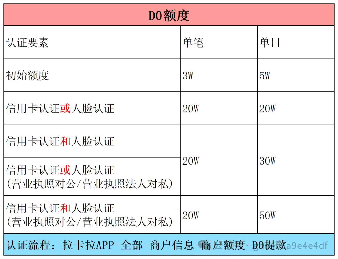 拉卡拉限額表(如下图所示):